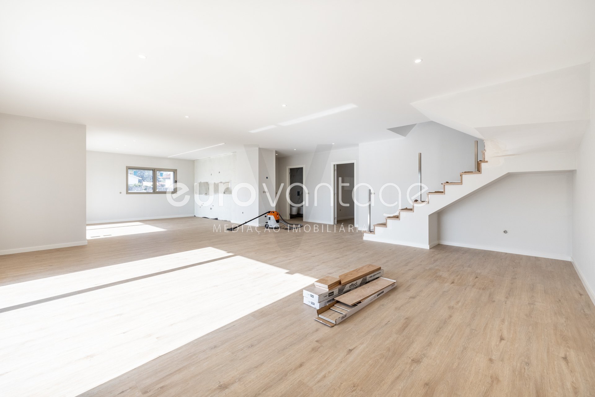 Rés do chão: hall, sala e cozinha em open space, WC, quarto/escritório, garagem e zona de lazer com churrasqueira.
